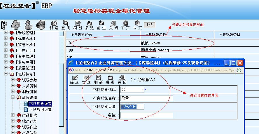 不良现象设置、不良原因设置。