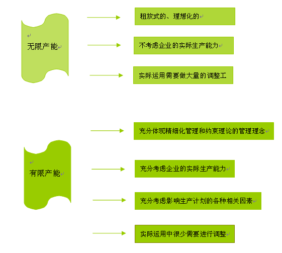 有限产能:是对无限产能的一个有效补充和完善。有限产能在安排生产计划时充分考虑企业中影响计划的各种因素。如考虑生产机台的安排、负荷、人员安排、负荷及其他和生产相关的各种因素。这样计划几乎是按需所制定的、到运用时需要调整的就微乎其微了。计划很好的实现了是精细化管理和约束理论的管理理念。